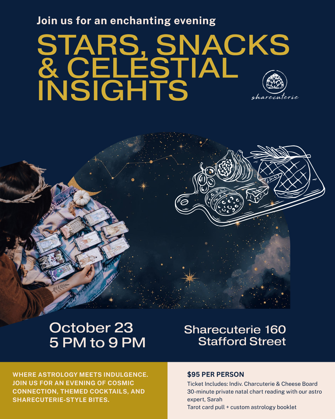 Where astrology meets indulgence. Join us for an enchanting evening of cosmic connection, themed cocktails, and Sharecuterie-style bites.