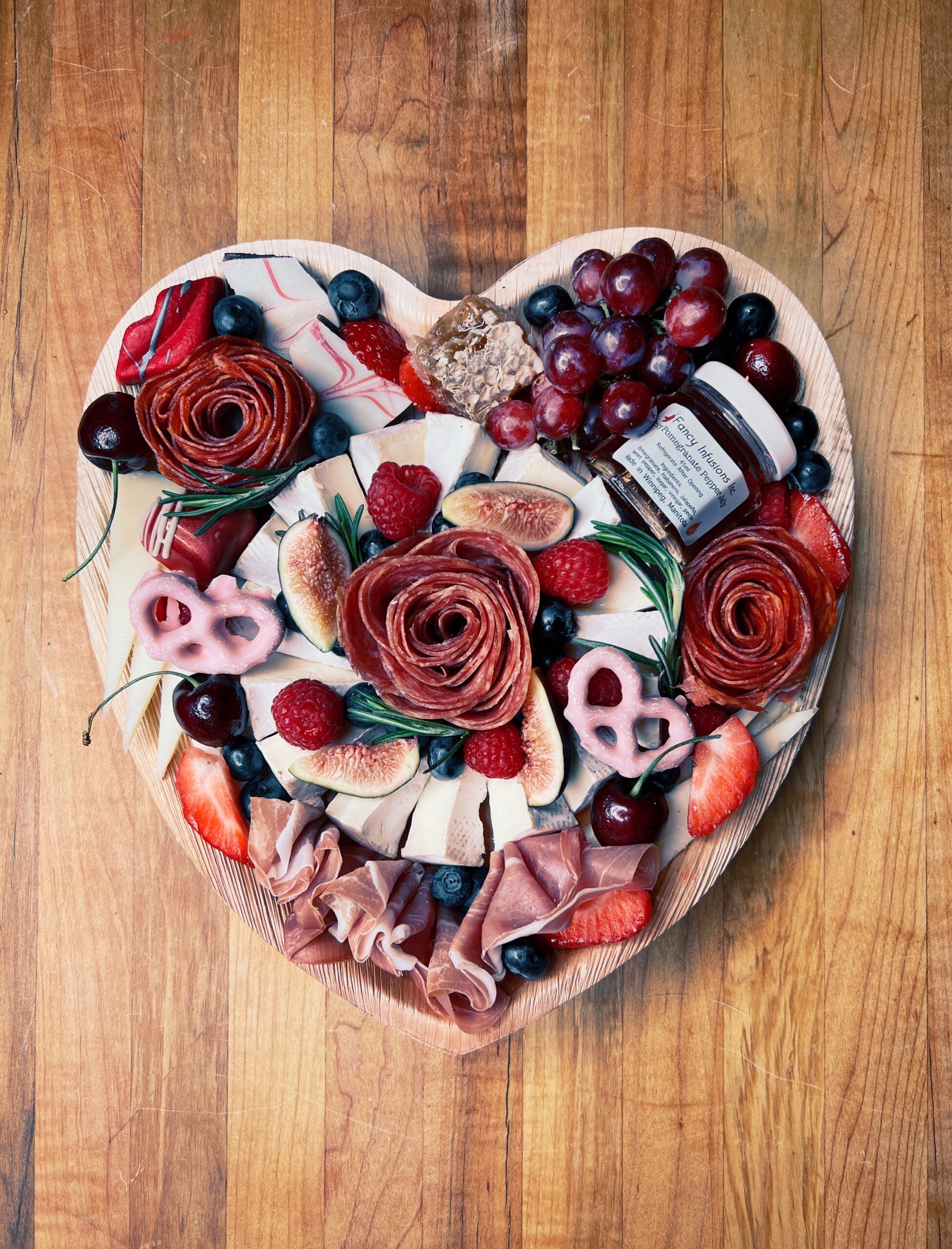 This heart shaped board for 2-3 artisanal cheeses, 3 types of cured meat, fresh fruit and locally made Valentine’s Day treats.